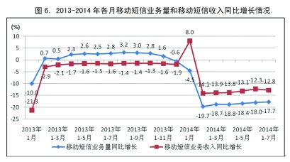 移動電話用戶月均短信發送量不足40條,移動短信業務收入占比降至4.5%。微信等OTT業務對傳統短信、彩信等消息類業務的替代作用持續加強。1~7月,全國移動短信業務量僅有4436.6億條,同比下降17.7%,其中由移動用戶主動發起的點對點短信量保持快速下滑趨勢,同比下降18.7%,占移動短信業務量的比例降至48.9%。彩信業務量僅有371.3億條,同比下降30.2%。月戶均點對點短信量、彩信量達到38.9條、2.1條,其中月戶均點對點短信量同比下降19.5%。移動短信業務收入持續下滑,同比下降12.8%,收入規模占電信業務收入的比例由上年同期的5.3%降至4.5%。