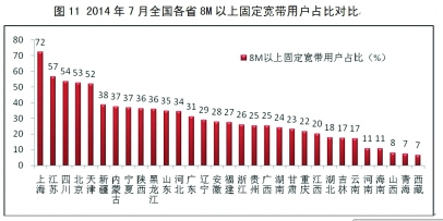 7月,東、中、西部地區8M以上固定寬帶用戶分別達到3964.5萬戶、967.3萬戶、1374.9萬戶,其中東部地區占比達到62.9%,比上年末下降了4.5個百分點。8M以上固定寬帶用戶占比地區差異明顯,東部地區8M以上固定寬帶用戶占比達37.7%,比中西部地區分別高18.6和4.6個百分點。全國8M以上寬帶用戶占比超過50%的省份是上海、江蘇、四川、北京和天津,分別達到72.2%、56.5%、53.6%、52.6%和51.9%。全國8M以上寬帶用戶占比提高最快的三個省份是天津、四川和內蒙古,分別比上年末提高27、24.9和23.4個百分點。