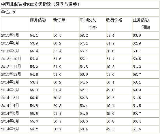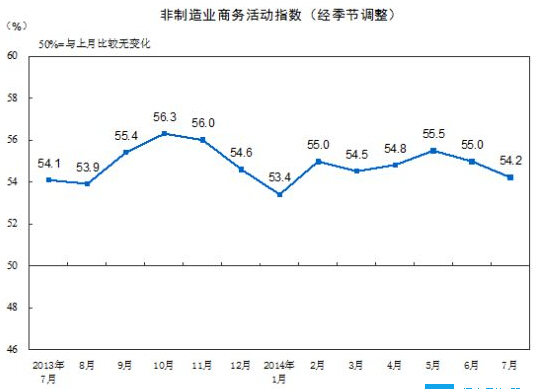 2014年7月,中國非制造業商務活動指數為54.2%,雖比上月回落0.8個百分點,但仍高于榮枯線4.2個百分點。