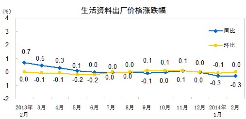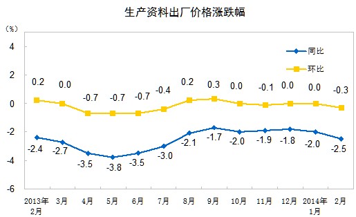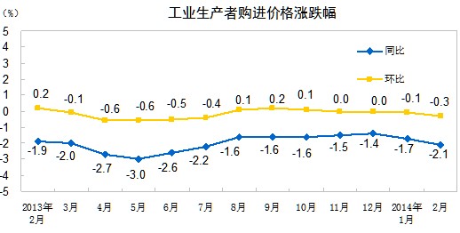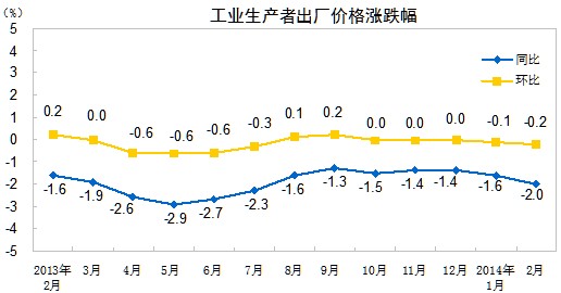 國家統計局網站消息,2014 年2 月份,全國工業生產者出廠價格同比下降2.0% ,環比下降0.2% 。工業生產者購進價格同比下降2.1% ,環比下降0.3% 。 1-2 月平均,工業生產者出廠價格同比下降 1.8% ,工業生產者購進價格同比下降1.9% 。