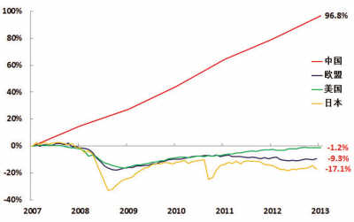在過去6年中,中國工業產值幾乎翻了一番,而美國、歐洲、日本卻連危機前水平都還未恢復。8月7日中國統計局發布的數據顯示,2007年7月至2013年7月,中國工業產值增長了97%,而美國卻下降了1%。盡管歐洲和日本尚未公布2013年7月工業產值數據,但2007年7月到2013年6月的數據也可以說明這一問題——歐洲下降了9%,而日本下降了更多,達到17%。