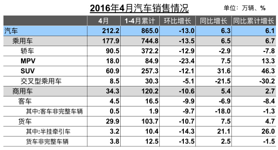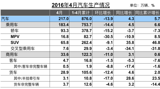 2016年4月,汽車生產217萬輛,環比下降13.91%,同比增長4.25%;銷售212.24萬輛,環比下降13.01%,同比增長6.32%。
