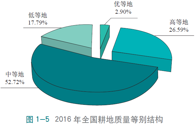 截至2015年末,全國耕地質量等別調查與評定面積為13462.4萬公頃(20.19億畝),全國耕地平均質量等別為9.96等。