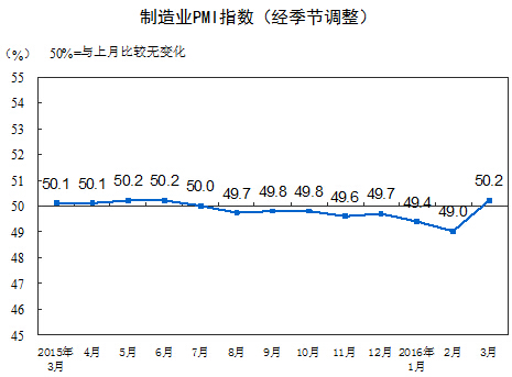 2016年3月份,中國制造業采購經理指數(PMI)為50.2%,比上月上升1.2個百分點,重回擴張區間。