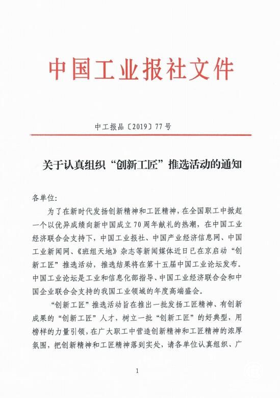 為了在新時代發揚創新精神和工匠精神,在全國職工中掀起一個以優異成績向新中國成立70周年獻禮的熱潮,在中國工業經濟聯合會支持下,中國工業報社、中國產業經濟信息網、中國工業新聞網、《班組天地》雜志等新聞媒體近日已在京啟動“創新工匠”推選活動,推選結果將在第十五屆中國工業論壇發布。中國工業論壇是工業和信息化部指導、中國工業經濟聯合會和中國企業聯合會支持的我國工業領域的年度高端盛會。
