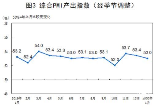 截至2020年1月20日,采購經理調查結果顯示, 1月份,中國制造業PMI為50.0%,非制造業商務活動指數為54.1%,綜合PMI產出指數為53.0%。