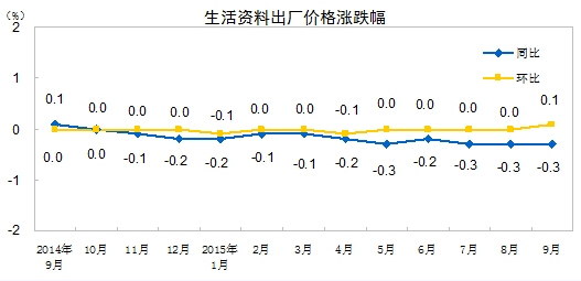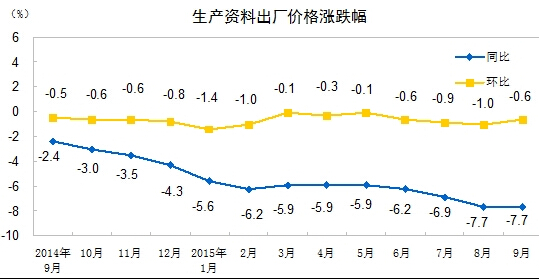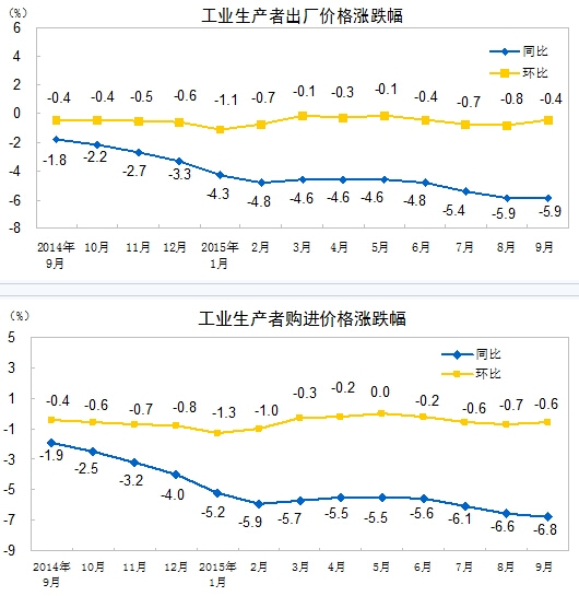 2015年9月份,全國工業生產者出廠價格環比下降0.4%,同比下降5.9%。工業生產者購進價格環比下降0.6%,同比下降6.8%。1-9月平均,工業生產者出廠價格同比下降5.0%,工業生產者購進價格同比下降5.9%。