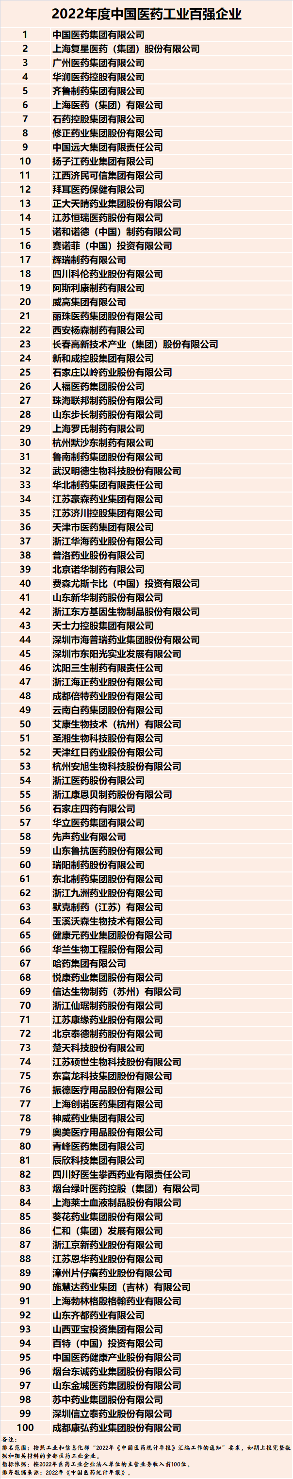 11月17日,由工業和信息化部、北京市人民政府、國家衛生健康委員會、國務院國有資產監督管理委員會、國家中醫藥管理局、國家藥品監督管理局共同舉辦的“2023中國醫藥工業發展大會”在北京開幕。“第40屆全國醫藥工業信息年會暨2022年度中國醫藥工業百強論壇”于11月18日在會期舉辦,會上發布了備受行業關注的2022年度中國醫藥工業百強榜單。中國醫藥集團有限公司、上海復星醫藥(集團)股份有限公司、廣州醫藥集團有限公司位列前三甲。