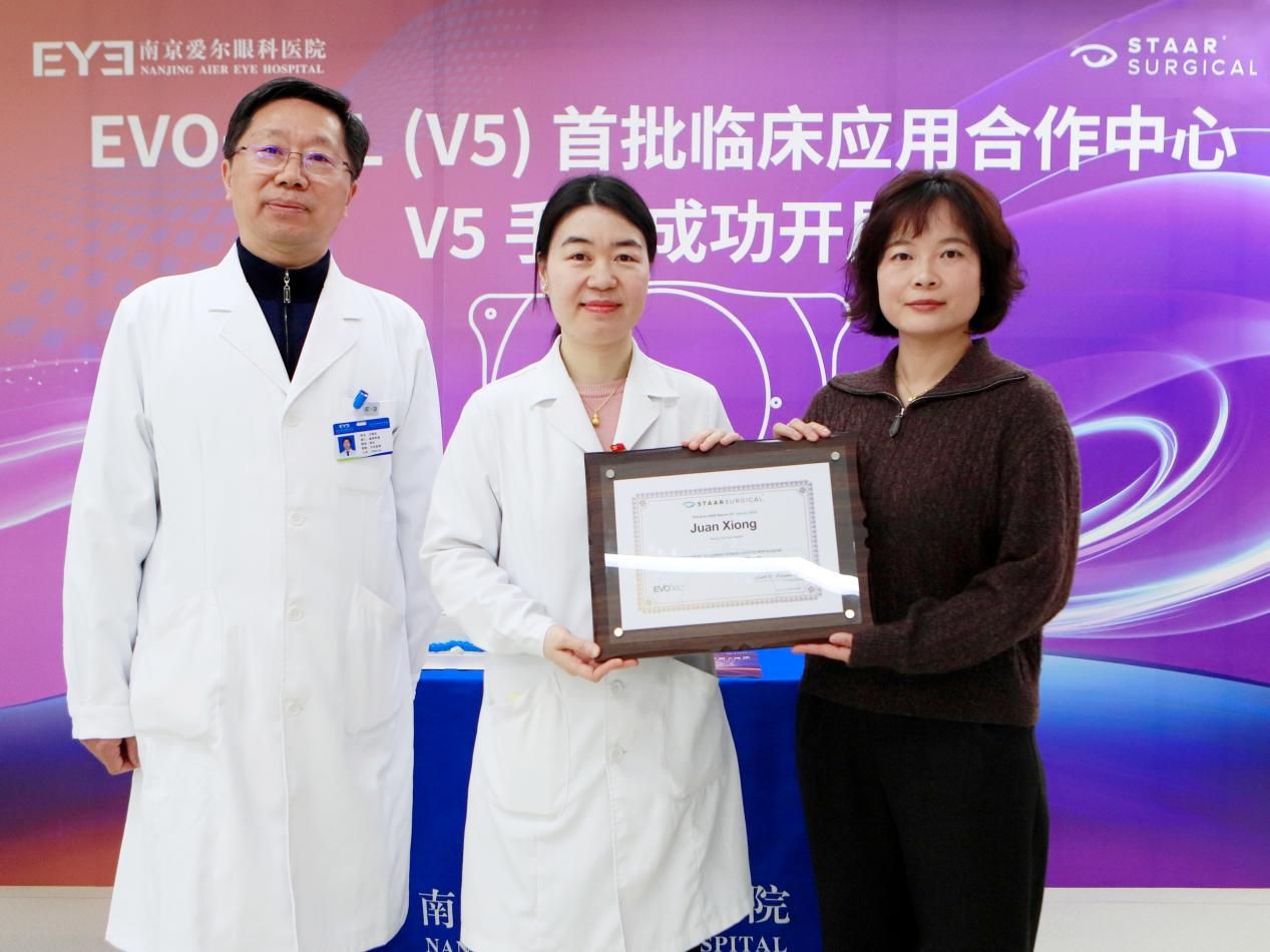 1月13日,全球領先的眼內屈光矯正技術迎來新的里程碑。在南京愛爾眼科醫院舉行的授牌儀式上,瑞士STAAR Surgical公司正式授予南京愛爾眼科醫院“EVO+ ICL (V5) 首批臨床應用合作中心”資質,同時授予醫院屈光手術科主任熊娟“EVO+ ICL (V5) 認證手術醫師”證書。這標志著該項以優化夜間視覺為核心優勢的國際新一代近視矯正技術,在南京地區獲得了官方的臨床應用許可與專家認證,江蘇地區的近視患者將能更便捷地享受到與國際同步的“日夜高清”視覺體驗。