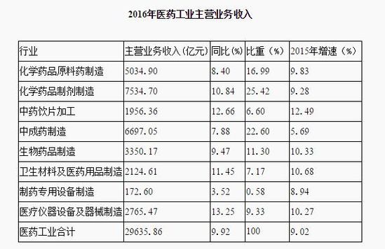 2016年醫藥工業規模以上企業實現主營業務收入29635.86億元,同比增長9.92%,增速較上年同期提高0.90個百分點,增速高于全國工業整體增速5.02個百分點。各子行業中,增長最快的是醫療儀器設備及器械制造,化學原料藥、中成藥、制藥設備的增速低于行業平均水平。