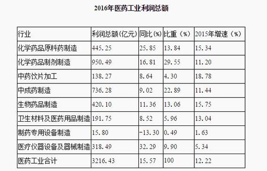 2016年規模以上醫藥工業增加值同比增長10.6%,增速較上年同期提高0.8個百分點,高于全國工業整體增速4.6個百分點,位居工業全行業前列。醫藥工業增加值在整體工業增加值中所占比重為3.3%,較上年增長0.3個百分點,醫藥工業對工業經濟增長的貢獻進一步擴大。