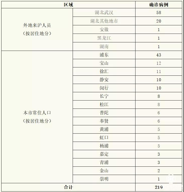 截至2月4日12時,上海市已累計排除疑似病例527例,發現確診病例219例。確診病例中,男性112例,女性107例;年齡最大88歲,最小7月齡;121例有湖北居住或旅行史,8例有湖北以外地區居住或旅行史,90例有相關病例接觸史;外地來滬人員81例,本市常住人口138例。具體情況如下: