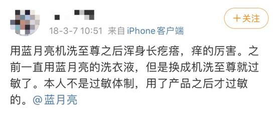 2018年3月7日,有網友在微博平臺稱,使用藍月亮機洗至尊洗衣液后渾身長疙瘩,之前一直用藍月亮的洗衣液,換成機洗至尊就過敏了。該網友還稱自己并不是過敏體質,用了上述產品后才過敏。