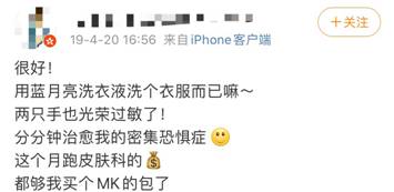 2019年4月20日,一網友在微博平臺稱,用了藍月亮洗衣液洗衣服后手部過敏嚴重。