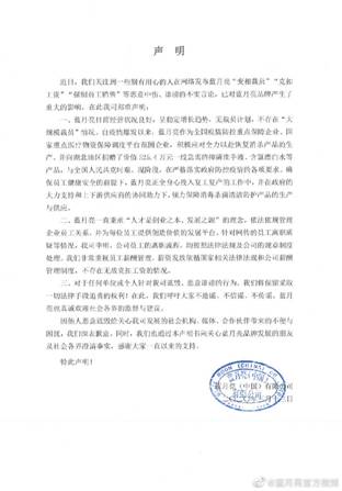 面對網上諸多質疑,藍月亮(中國)官方微博3月13日曾發布聲明稱,目前公司經營狀況良好,無裁員計劃,不存在“大規模裁員”。公司員工的離職流程,均按照規定處理,不存在無故克扣工資的情況。此次別有用心的人發布的藍月亮“變相裁員”“克扣工資”“強制員工銷售”等惡意中傷、誹謗的不實言論,公司將保留采取一切法律手段追責的權利。