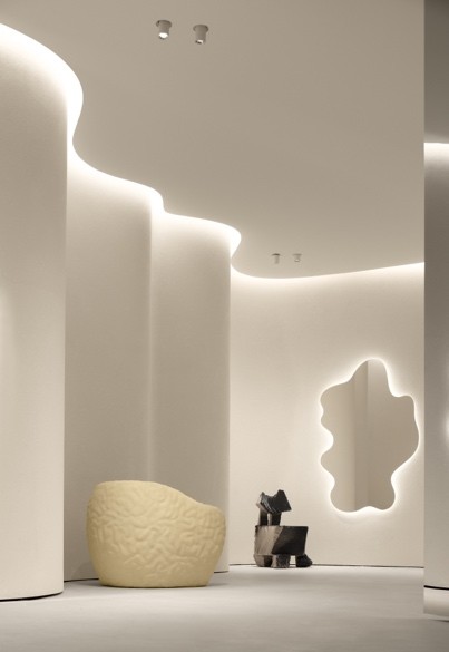 拾級越過金屬屏風,進入客廳內部,整面水波紋形墻體與鏡面相互輝映,在由清華建筑學院燈光設計師團隊設計的光線下,泛著水波一樣的柔光。水波紋的形態源自夏天傍晚的池塘,代表了觀夏對于自然的提取與構造。同樣的元素亦反復出現在陳列臺與香薰外包裝的設計中。