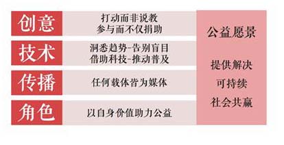 鳳凰網所倡導的創新公益,有四點非常重要:第一通過創意而非說教解決問題;第二通過技術和科技推動問題解決,而不是盲目號召和抱怨;第三打開了傳播的界限,所有參與的各方都能成為媒介;第四在角色轉化上,不是贊助方花錢做秀,而是讓每個參與其中的平臺都能從中都受益,實現共贏。
