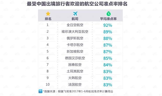 根據航空數據平臺飛常準收集的2017年前六個月的航班準點率數據,在全球最受中國消費者歡迎的航空公司中,全日空航空以平均92%的準點率高居榜首;維珍澳大利亞航空、俄羅斯航空、卡塔爾航空和新加坡航空以超過85%的平均準點率位列前五;較高的準點率有助于提升乘客整體飛行舒適度水平,贏得更多忠實消費者。值得注意的是,2017年上半年航班準點率數據統計結果中,中國四大航空公司的準點率均未超過80%,未能進入航空公司準點率前十名。