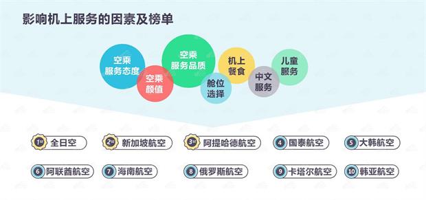 調查顯示,空乘人員的服務品質和態度能最直接地影響乘客在飛行途中的機艙體驗。中國出境游旅客對機上服務的評價指標及要求越來越細節化,對人性化的服務內容有了更高的要求。此外,航班是否提供中文服務和對待兒童的服務水平也相繼成為影響旅客對機艙服務的評價的重要因素。數據顯示,中國出境游旅行對亞太地區航空公司的機上服務認可度較高,其中全日空航空公司的機上服務水平以總88分獲得乘客最高評價,其專業貼心的日式服務讓好口碑得以延續;緊隨其后的是新加坡航空、阿提哈德航空和國泰航空。國內航空公司中,海南航空以58分實力位列第七名,成為唯一入駐前十名的國內航司。