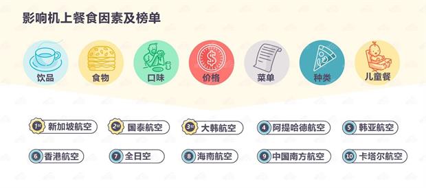 “舌尖上”的享受也是影響中國旅客衡量航司服務水準的關鍵指標之一。除了口味、種類和是否提供靈活的菜單選擇等衡量飛機餐食質量的常規標準之外,隨著親子游持續火熱,中國出境自由行家庭對機上兒童餐食的質量關注度也在不斷提高。在“機上餐食榜單”中,新加坡航空與國泰航空高居榜首,兩大航司的餐食質量和擺盤均有較高水準;另外,大韓航空提供的拌飯、海帶湯等獨具韓式特色的餐食也頗受中國游客喜愛,名次位列第三;阿提哈德航空的中東口味餐食,全日空的日式機上便當也陸續躋身前十,圈粉不少中國“吃貨”;海南航空和中國南方航空也位列前十,為中國旅客的空中“中國胃”保駕護航。