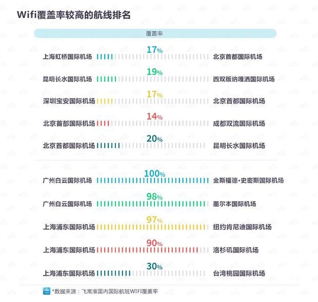 在機上WIFI覆蓋率方面,國際航線中,從廣州飛至澳洲、從上海前往美國的WIFI覆蓋率相對較高,其中從廣州飛往悉尼的航班更是實現了100%的WIFI覆蓋率,極大提升了乘客長途飛行的機上娛樂體驗水平;相比之下國內航線的Wifi覆蓋率仍普遍停留在較低水平,平均覆蓋率不足20%。