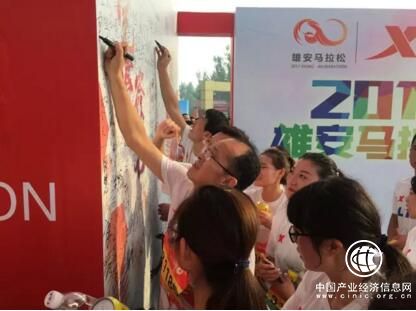 參加完五公里健康跑的人們紛紛在"2017雄安馬拉松5K真跑者名字墻"上簽名留念。劉向陽攝