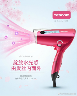 型號是TCD4000,吹風機出風口自帶一個膠原蛋白盒,除了有實打實的膠原蛋白,還能吹出納米水離子。新增的納米水離子,由吹風機上的納米霧化水霧生成器生成,利用空氣中的水分在生成器中作結露作用,再利用放電效應使露珠霧化成納米尺寸。據說,因為水霧很小,所以吹到頭發上不會使人覺得明顯的濕意(日本官方資料解釋)。至于效果,根據使用過的童鞋評論,一致認為頭發變得順滑,有光澤,并且不打結。