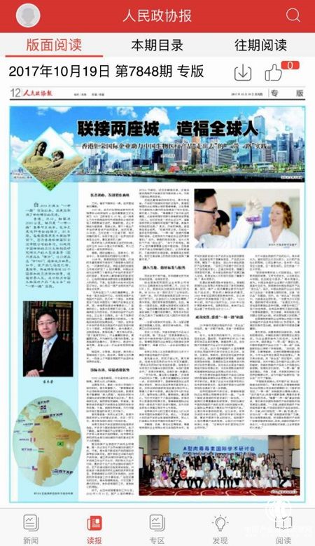 《人民政協報》近日專版刊文“聯接兩座城,造福全球人”,以愛國港商袁木榮,成功助力中國生物醫療產品“走出去”的故事,展現“一帶一路”倡議以來,其建設取得了舉世矚目的成績。