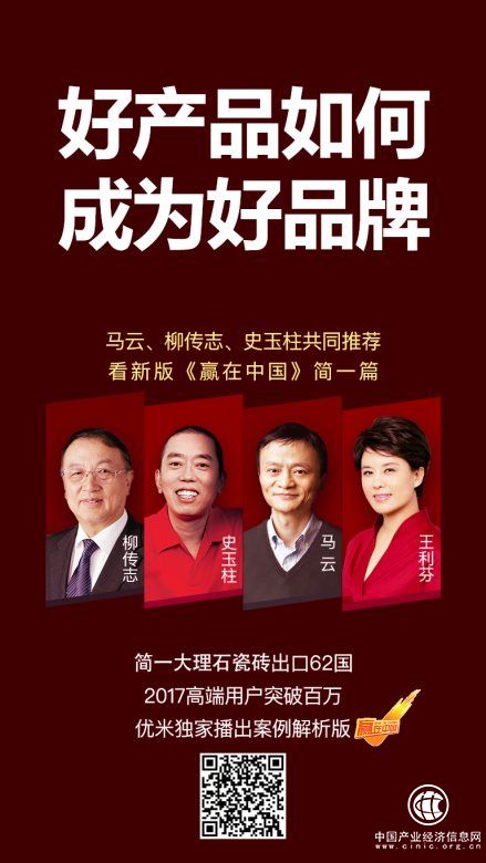 在這里,我們仿佛看到中國傳統制造業別樣的機會。在這個最能代表中國(China)的行業里,簡一大理石瓷磚以高端品牌建設、產品技術創新、服務與體驗升級、主動參與國際化競爭,真正關注用戶需求等關鍵點使品牌走向高端贏得顧客選擇,從好產品向好品牌轉變。回顧九年轉型歷程,簡一的創新思路及競爭戰略對當下傳統企業實現轉型升級有著重大的啟迪和借鑒意義。