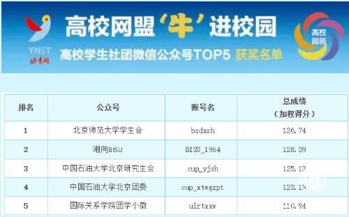 北京高校互聯網聯盟(以下簡稱“高校網盟”)由共青團北京市委指導,北青網與北京十余所高校聯合發起成立。“高校網盟‘牛’進校園——首都高校自媒體星榜評選”活動以雙周為一個打榜評選周期,分多期進行。榜單評選出三個優秀獎項:優秀官方微信公眾號TOP5、優秀學生團體微信公眾號TOP5、雙周優秀文章TOP10。活動由蒙牛集團獨家贊助,提供1150箱牛奶獎勵入榜團隊及個人。