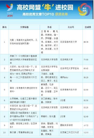 “高校網盟‘牛’進校園——首都高校自媒體星榜評選”第9期(2017年10月1日至10月14日)榜單于2017年10月26日發布評選結果,榜單詳情如下: