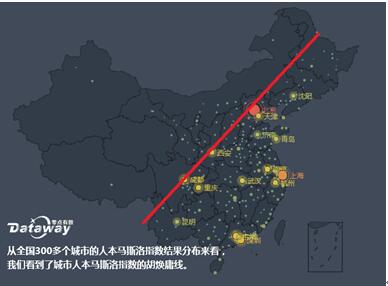 零點城市大數據研究院執行院長閆晶博士認為,"胡煥庸線最早是人口地理學的概念,胡煥庸線以東的人口占全國總人口的95%以上。前幾年,有學者提出胡煥庸線是城鎮化水平的分割線,線以東的高于全國平均水平,線以西的低于全國平均水平。城市人本馬斯洛指數的分布結果,更大程度上印證了這一觀點,而且進一步提出城鎮化水平的新特點,不僅是城市硬件發展的齊備才叫城鎮化,更需要突出人本主義的城市發展理念和服務能力,這才是更現代、更高含金量的、更具市民獲得感的城鎮化。因此,胡煥庸線不僅是人口分割線、氣象分割線,更是文化轉換分割線,是城市文明的分割線。而且從國家層面來看,我們的啟示是:城市文明的不均衡是比人口的不均衡更需要重視的,對于西部地區的開發要特別重視城市定位、城市發展理念的灌輸。否則這個不均衡會更加加劇,更不容易彌合和平衡。"