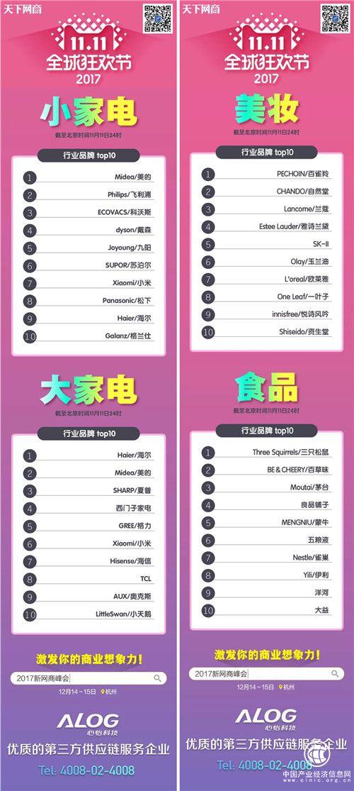在這樣一個流量爆棚的日子,消費者徜徉在“買買買”的喜悅中的同時,更是對廣大品牌的大閱兵。從公布的各行業天貓雙十一店鋪銷售排行來看,國貨品牌完成了本次戰役的全面勝利!海爾領跑大家電行業,美的在小家電行業領先,百雀羚、三只松鼠、林氏木業、海瀾之家、維達紙業等在各自所屬領域,都取得了NO.1的佳績。以上這些品牌,在本次雙十一戰役中,向世界完美宣布了中國新國貨時代的來臨,是民族品牌的驕傲!