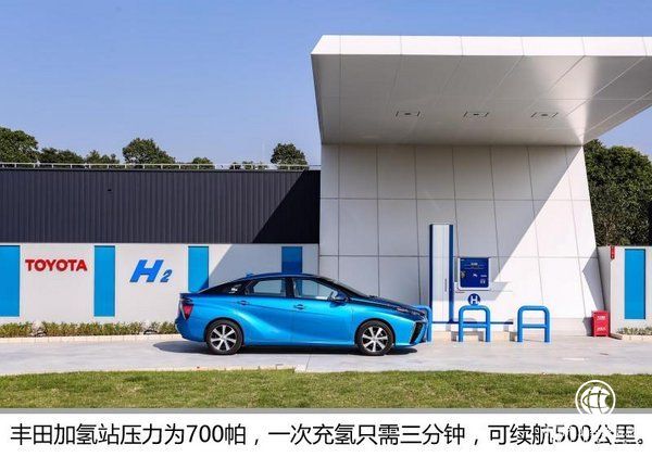 而豐田的這款MIRAI氫燃料電池車,外觀和內飾與混合動力的豐田普銳斯很相像,駕駛感受很像高端的純電動車,沒有聲音,加速性特別好。不過在研發中心壓力700帕的加氫站,一次充氫只需要三分鐘,續航里程500公里,便利性和傳統汽車一樣好。