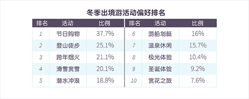 從冬季出境游項目整體來看,年底出境購物依舊是冬季出行的主要活動之一,占據整體活動的37.7%,國外各大商場和品牌的重磅圣誕折扣和年終促銷對國內游客依舊具有極大吸引力。同樣值得注意的是登山徒步活動排名僅次于購物,占整體游客喜愛活動的25%;具有節日特色體驗的跨年煙火和滑雪賞雪活動也是冬季出游熱門項目,分別占比21%和20%。除了滑雪和賞雪,滑冰、體驗極地摩托和雪地摩托、看冰雕雪雕也是越來越受游客喜愛的出境游活動。