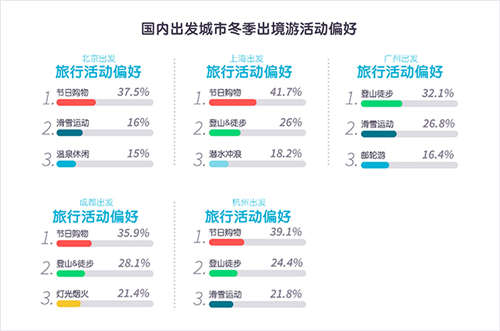 從國內重點一、二線城市在冬季出行趨勢的表現來看,年底節日購物依舊是重點城市冬季出境游剛需,依舊占據大多城市旅行活動榜首,該項活動在上海游客中占比最高,達到近42%;相對其它城市,北京游客更喜愛冬季出境泡溫泉,這一占比達到15%;而越來越火爆的郵輪游則備受廣州游客歡迎,有16.4%的廣州出境游愛好者有計劃在冬季乘坐郵輪出游;還有21.4%的成都游客對燈光節、跨年煙火和燈展表現出極大興趣。除北京外,廣州和杭州等極少見到大雪的南方城市對冬季出境滑雪更加充滿期待。