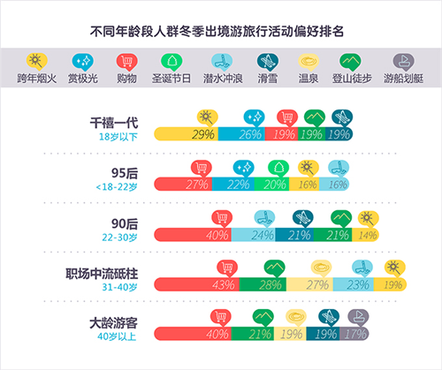 從不同年齡段人群冬季出境游活動偏好情況來看,千禧一代由于大多由父母陪同出游,在眾多旅行項目中,跨年煙火和賞極光成為兩大熱門,分別占比29%和25.8%;相對更具自主選擇權的95后大學生群體以及22-30歲出境游愛好者除了在購物實力方面不容小覷之外,各種形式的體驗游才是他們出行的真正目的,極光、圣誕、跨年和潛水沖浪都是他們的出行關鍵詞,敢想會玩兒的他們展示出了年輕一代的旅行理念;而31歲以上的游客,也是如今的職場中流砥柱和較為成熟的旅客,則更加偏好登山徒步和溫泉旅行等相對溫和的旅行方式。