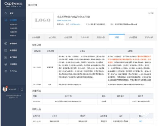 (被投企業的股東、經營地址變更信息、企業訴訟、經營異常等,可能導致投資風險的問題可及時推送給投資經理。)