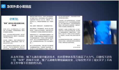 類似的還有一個關于急哭外賣小哥的回應。突然有一天網上瘋傳一個視頻,一個餓了么的外賣小哥,因為送餐馬上就要遲到,在電梯里急得大哭。大家一方面同情小哥,另一方面覺得平臺是不是有管理失誤的地方。我們也對此作了回應。