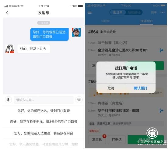 在騎手端的“蜂鳥配送”APP,新增的即時通訊工具還提供編輯常用語功能,供騎手一鍵發送文字與用戶溝通。為防用戶沒有及時查收信息,APP還新增一鍵撥打用戶電話按鈕,騎手點擊后,云端將自動撥打用戶電話,用戶接聽后為提醒取餐的錄音。