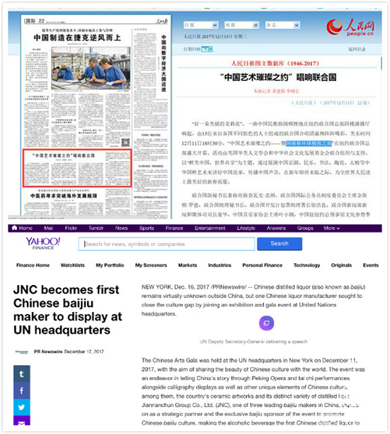 作為首家走進聯合國的中國白酒企業,劍南春此次驚艷亮相不僅受到了精英人士的好評,更引發了國內外主流媒體的高度關注,包括人民網、環球時報、FOX、雅虎等在內的多家媒體紛紛對此予以了報道。