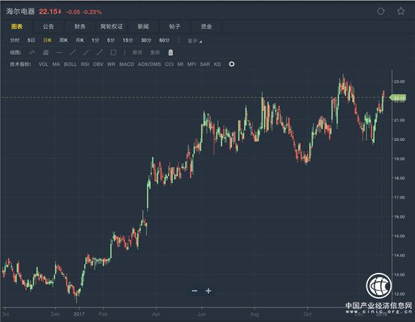 2017全年漲幅海爾電器主要研發、生產以及銷售“海爾”品牌的洗衣機和熱水器等電器。成立于1984年,產品銷售全球超過100個國家,曾被評為中國最受尊敬的品牌。