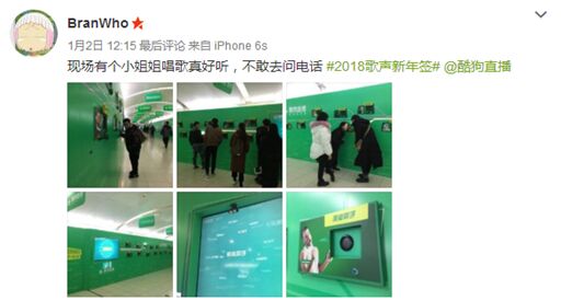 酷狗直播主打的“歌手多”,其實真不是夸大,在酷狗直播平臺上至少有35萬個歌手主播。“地鐵歌聲新年簽”活動借著節日的美好寓意,于2018年的第一天正式上線,路過的乘客與神奇的2018歌聲新年簽互動裝置產生了奇妙的化學反應,不僅很好的暗合了酷狗直播的品牌主張:歌手多(每個人都可以是歌手),還給北京和廣州兩個地方的乘客帶來了很好的觀賞與互動體驗:畢竟在每天那么多無聊辣眼睛廣告的熏陶下,期待值已經降低了很多,突然來這么一個又可以互動又養眼的廣告,頓時產生了大量的“自來水”。