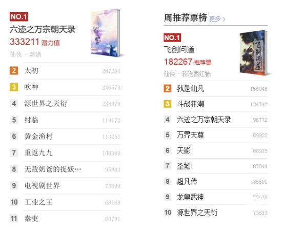 《六跡之萬宗朝天錄》位居起點簽約作家榜榜首和起點周推薦票榜第四名