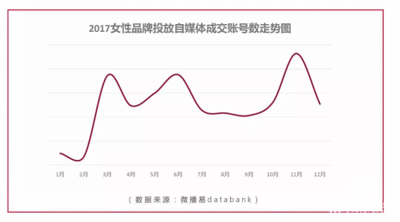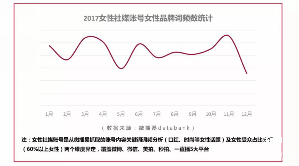 微播易對2017年女性社媒賬號中提及女性品牌詞的詞頻進行統計發現,3月女性品牌詞頻高出全年平均值27%,6月、11月為最高峰,這與品牌整體社媒投放金額曲線呈正相關。