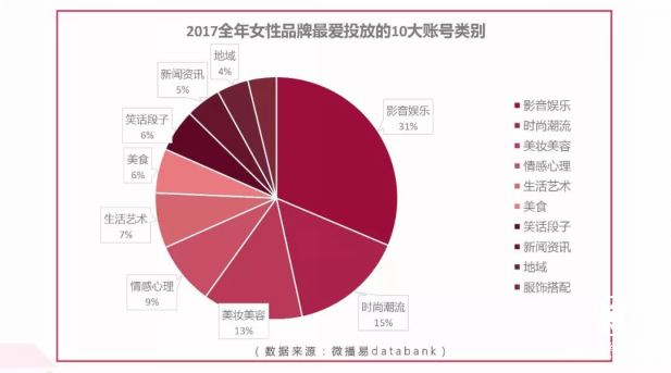 女性類品牌在投放中,也呈現出了比較明顯的女性特色,對于垂直類賬號投放更高。微播易數據顯示,2017年全年,影音娛樂、時尚潮流、美容美妝類自媒體賬號最受女性品牌喜歡,占比總投放的55%。