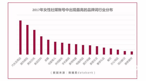此外,微播易還對2017年女性社媒賬號中出現最高的品牌詞行業分布情況進行了分析,發現: