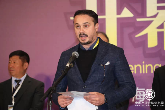 國際參展商代表在2018海寧中國國際皮革毛皮原輔料展暨海寧中國時裝面料展開幕式上發言。