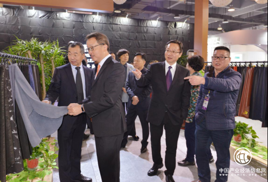 國際毛皮業協會董事及監事會主席王象志(左2)在海寧市人大主任姚敏忠(左1)、海寧皮革城董事長張月明(右2)等陪同下參觀2018海寧中國國際皮革毛皮原輔料展暨海寧中國時裝面料展。