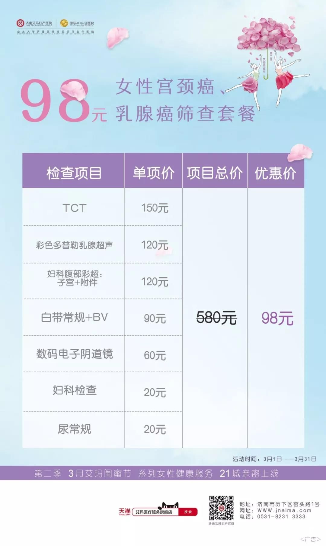 3月,在這個充滿愛與幸福的月份里,我們曾約定要一起健健康康到老。為了給女性朋友更好地服務,艾瑪婦產為泉城女性準備了第二重好禮:兩癌篩查體檢套餐——原價580元的體檢套餐限價98元,讓女性朋友精致地生活著,細致地愛自己。